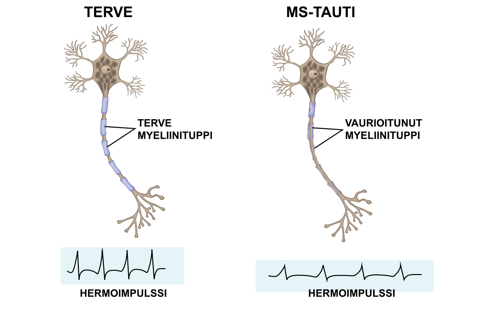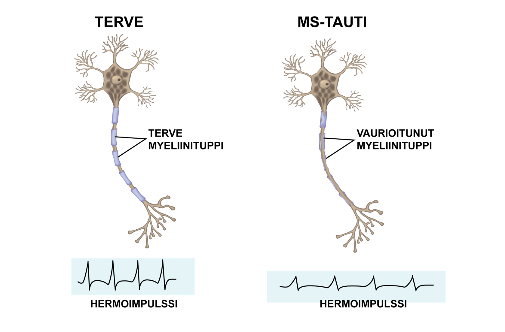 Myeliinituppi suojaa, eristää ja nopeuttaa hermoimpulssin kulkua. MS-taudissa hermosolujen myeliinitupit vaurioituvat, jolloin hermosolujen toiminta häiriintyy. Sairastuneella on esimerkiksi näkö- ja tuntohäiriöitä ja lihasheikkoutta.