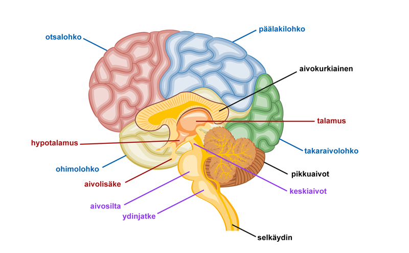- Aivoihin kuuluvat informaation käsittelyyn tarvittavat isoaivot, liikkeiden hienosäädöstä huolehtivat pikkuaivot sekä elämän perustoiminnoista vastaava aivorunko.